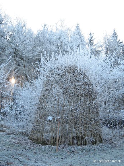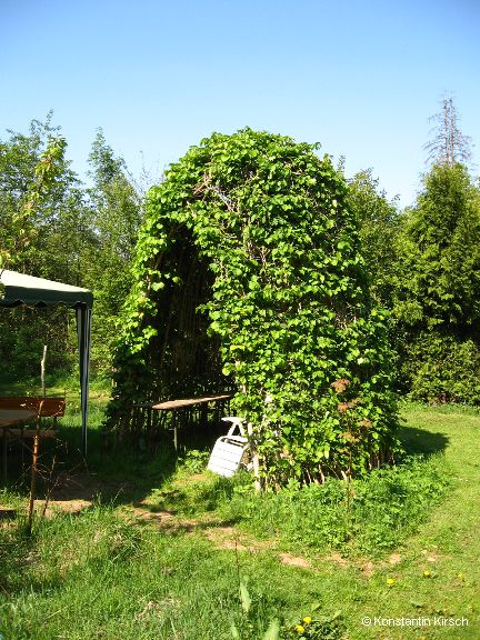 Neben der Wildnissdusche aus Haselnuss gibt es einen weiteren Naturbau aus Hasel. Diesmal wurden Baumhaseln (Corylus colurna) verwendet. Mittlerweile hat das Haus schon begonnen zu blühen und wird so alle Jahre Früchte produzieren!