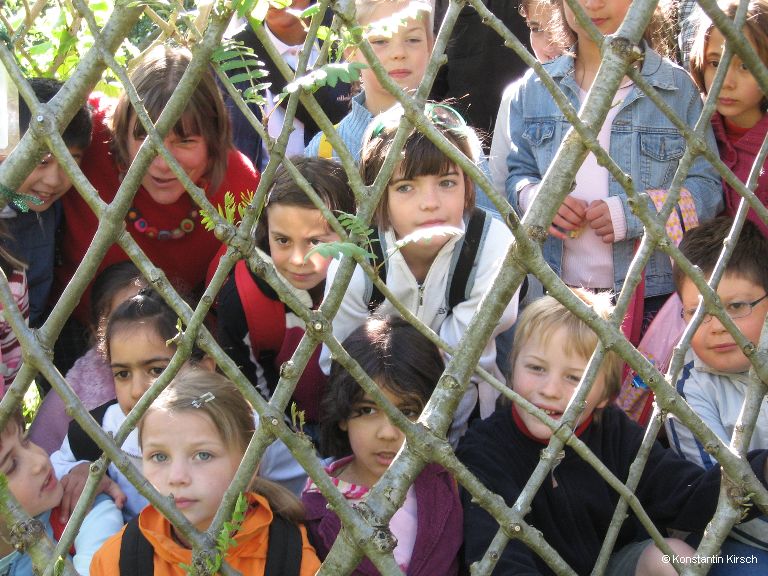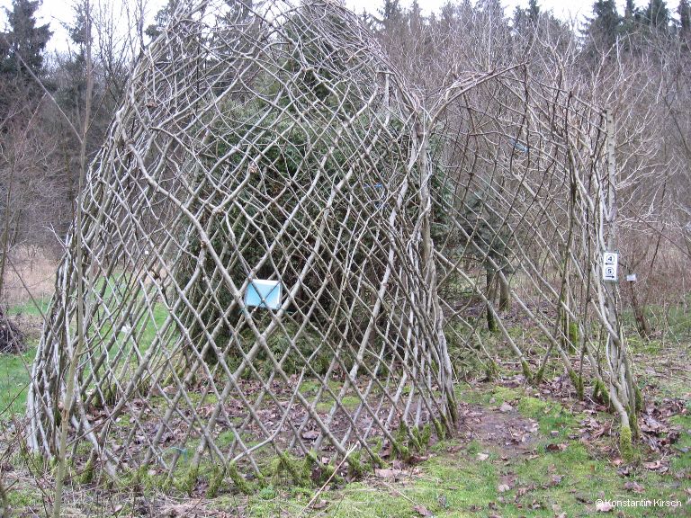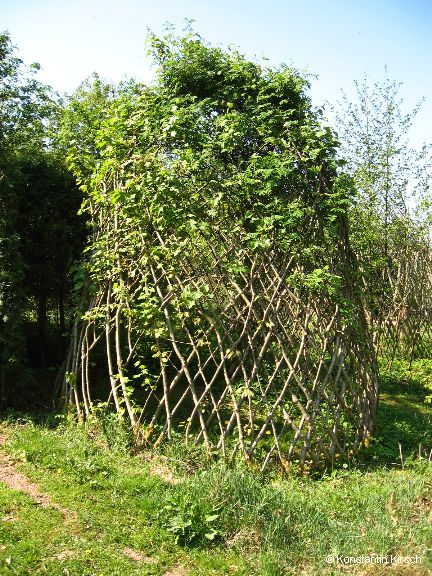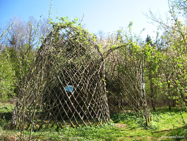 Das Spiralhaus besteht aus zwei verschiedenen Baumarten die miteinander verwachsen können: Vogelbeere (Sorbus aucuparia) und Elsbeere (Sorbus torminalis). Im Lauf der Jahre werden aus der Baumstamm-Kuppel zwei verschiedene Bäume wachsen. Gepflanzt 1995.
