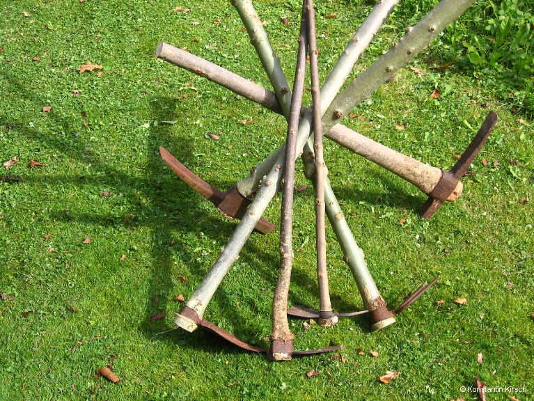 Lebende Äste wachsen durch gebrauchte Metallwerkzeuge. Im Lauf der Zeit verwachsen die Äste zu passgenauen Werkzeugstielen. Allerdings sind diese „Werkzeuge“ mehr Kunstwerke als für den täglichen Gebrauch.